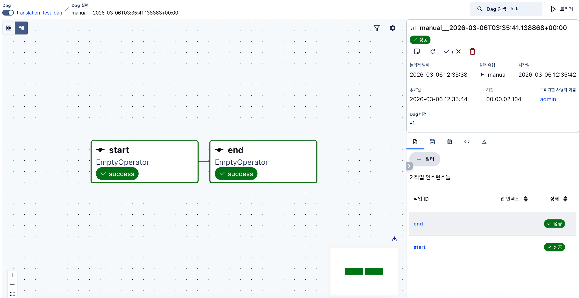 이제 변경한 dag.json 파일을 저장하고, 약간의 시간이 지난 후에 다시 airflow를 실행했습니다.
