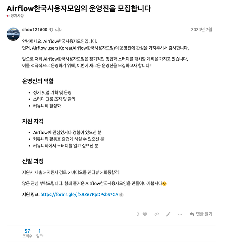 PS: 만약 Airflow 프로젝트 기여에 관심이 있는 분이 있으시다면 편하게 Airflow 한국 사용자 모임에서 저를 찾아주세요. 최대한 도움을 드리도록 하겠습니다.